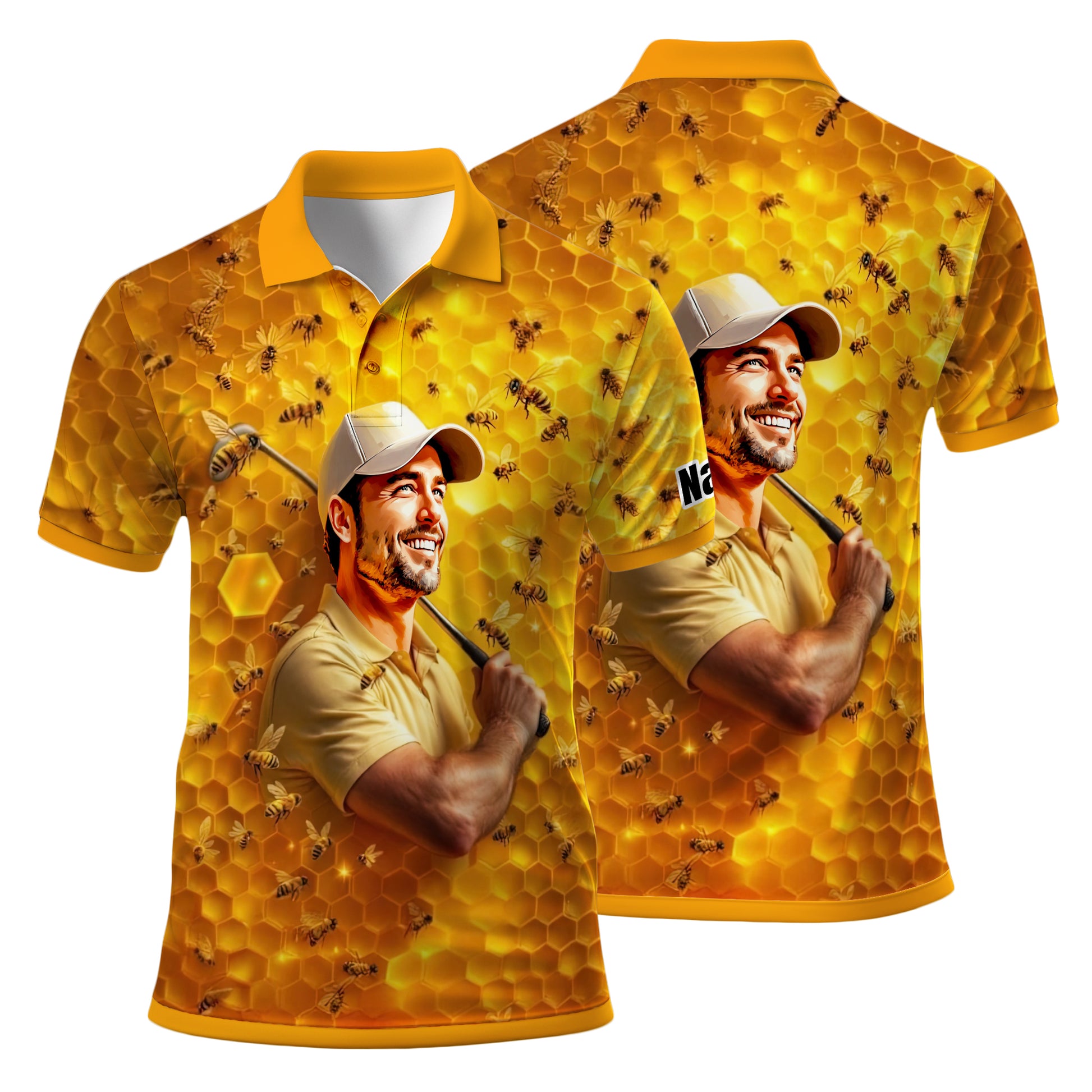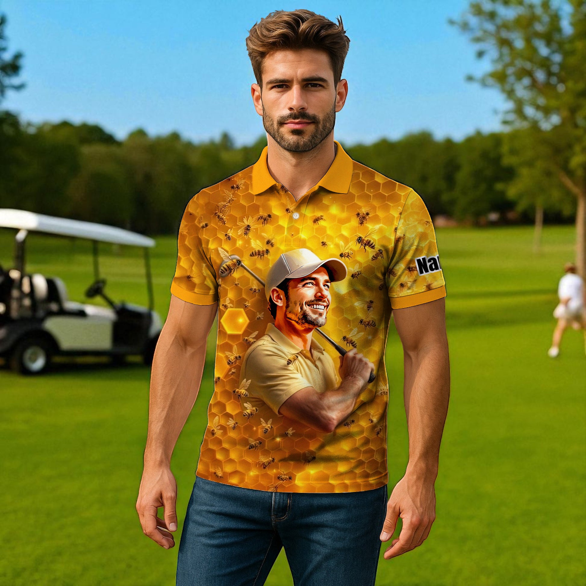 HomyGifts Men's Customized Face Artistic Golf Polo Shirt, Personalized Bee & Honeycomb Polo Shirt with Face, Funny Honey Lover Outfit, Summer Polo for Men Style 5