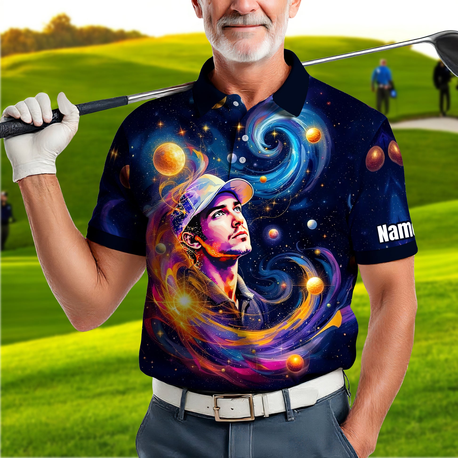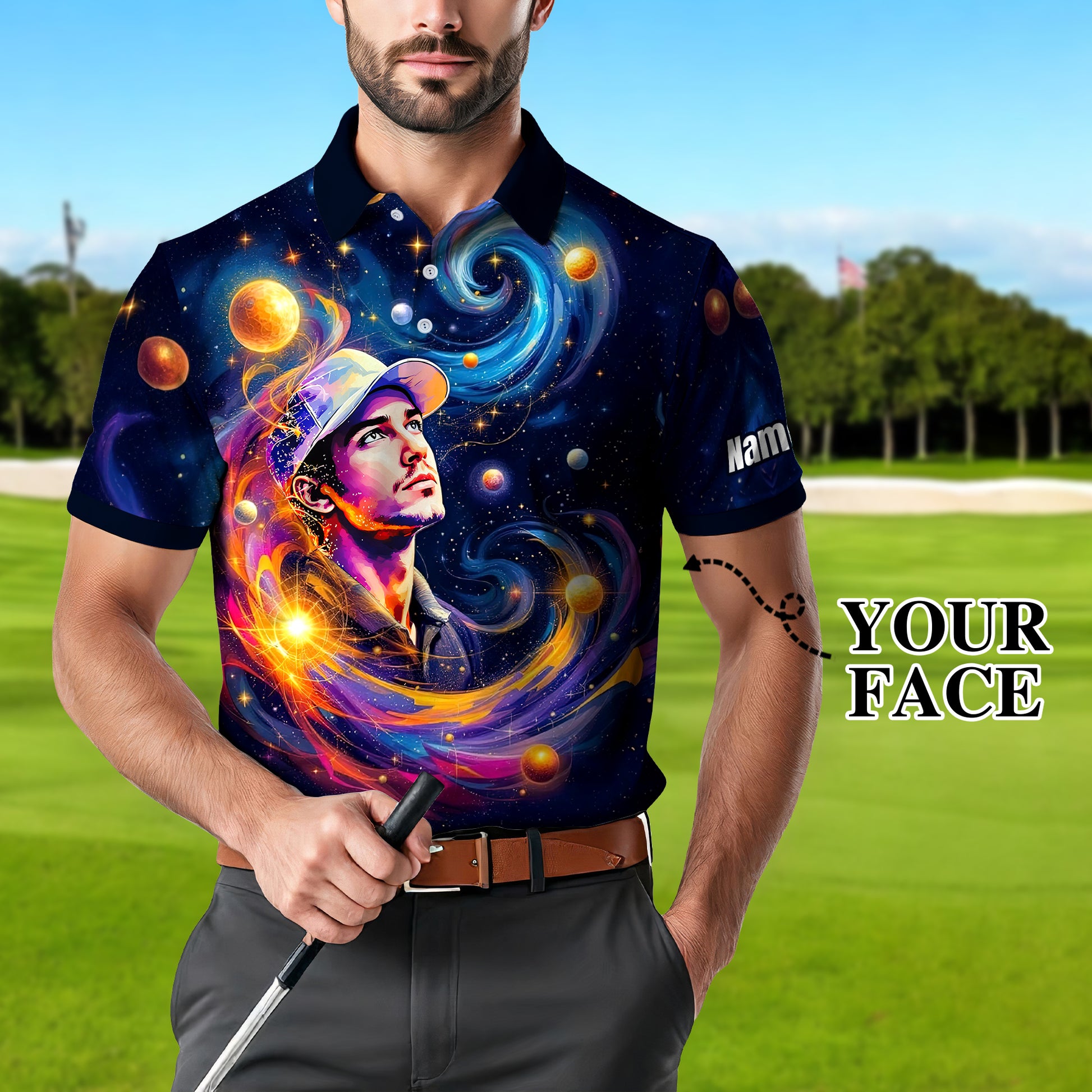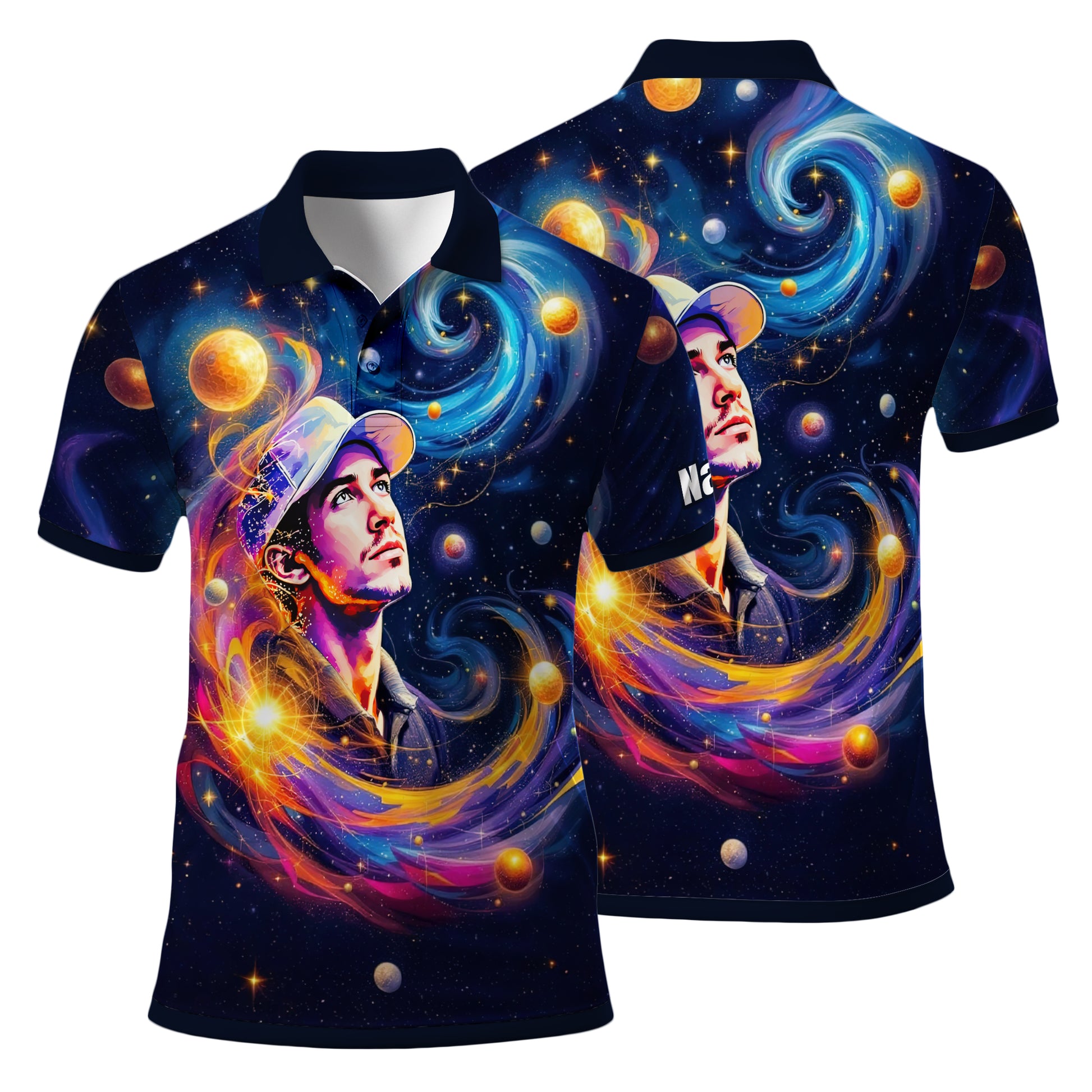 Custom Cosmic Portrait Polo Shirt – Personalized Surreal Galaxy Art with Your Face | Unique Gift for Golfers, Sports & Astrology Fans Style 3