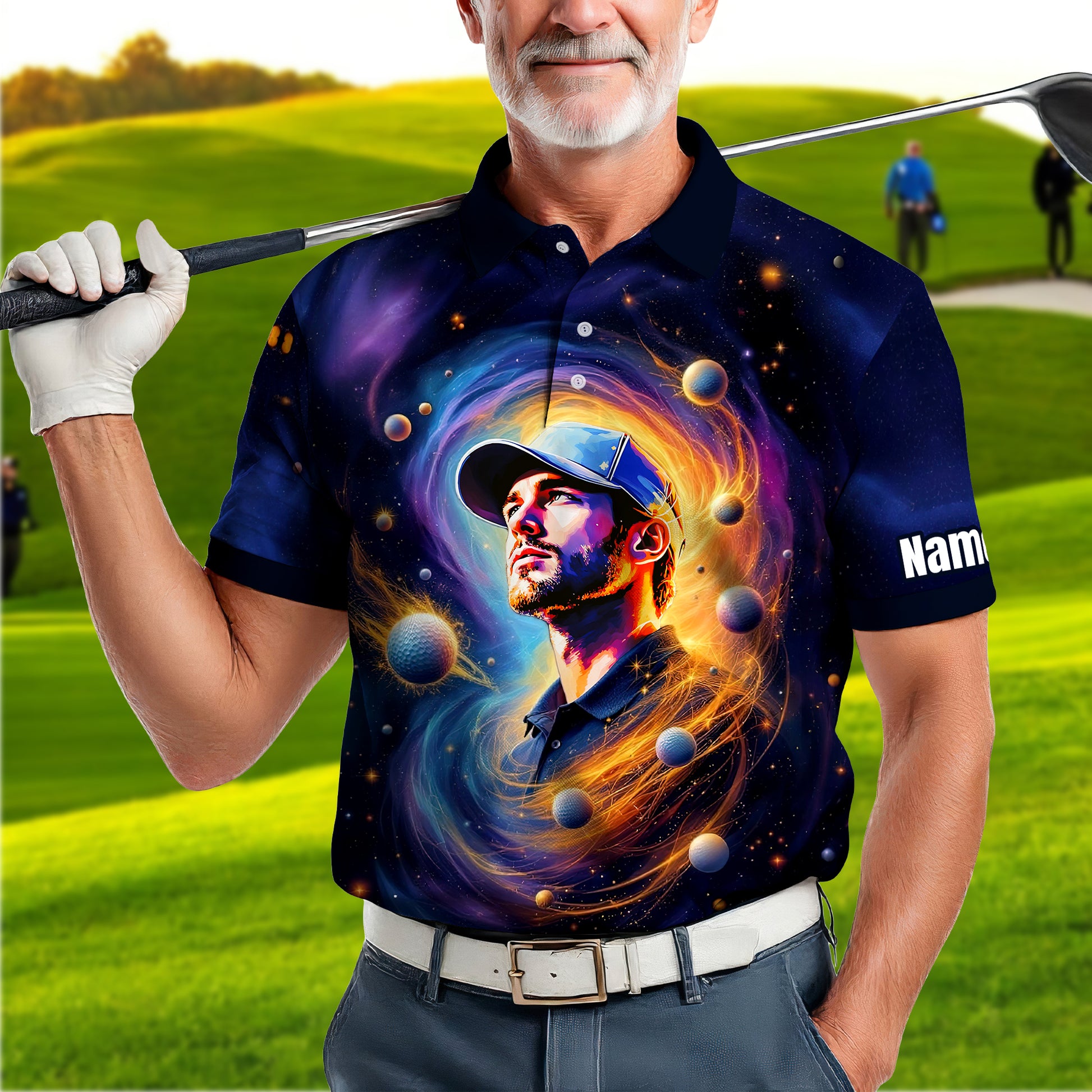 Custom Cosmic Portrait Polo Shirt – Personalized Surreal Galaxy Art with Your Face | Unique Gift for Golfers, Sports & Astrology Fans Style 4