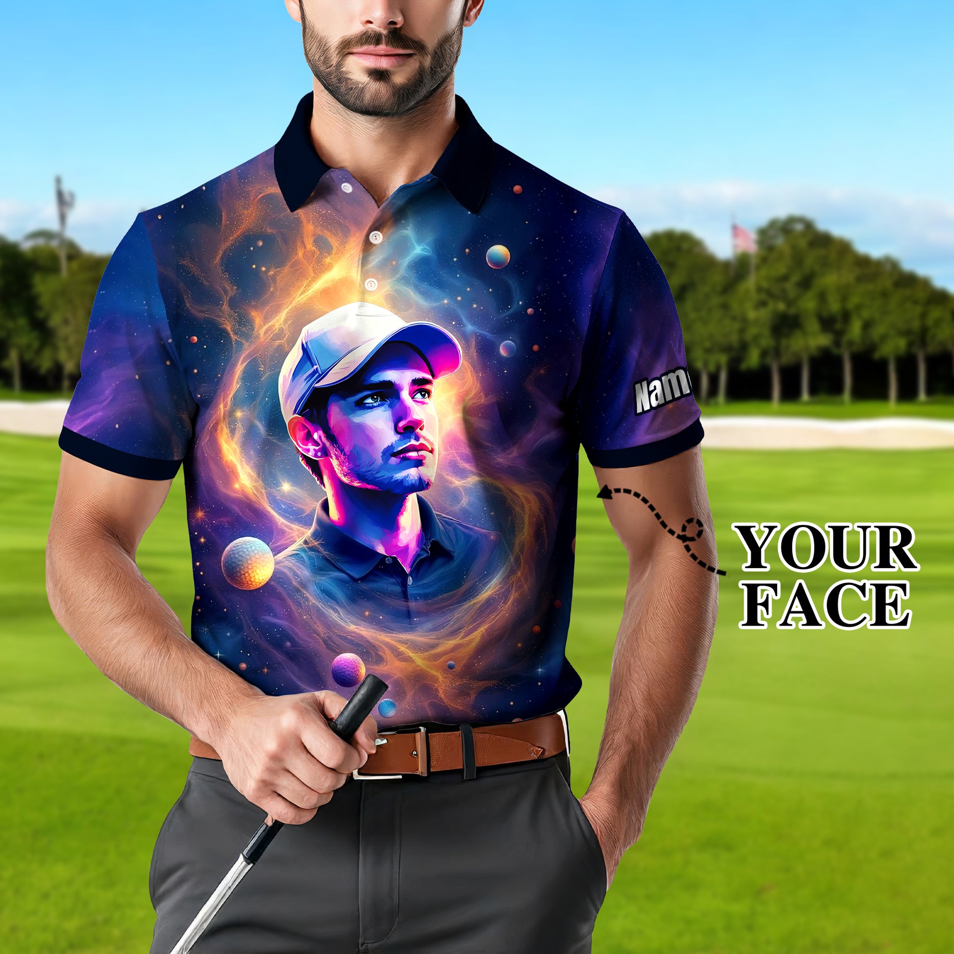 Custom Cosmic Portrait Polo Shirt – Personalized Surreal Galaxy Art with Your Face | Unique Gift for Golfers, Sports & Astrology Fans Style 6