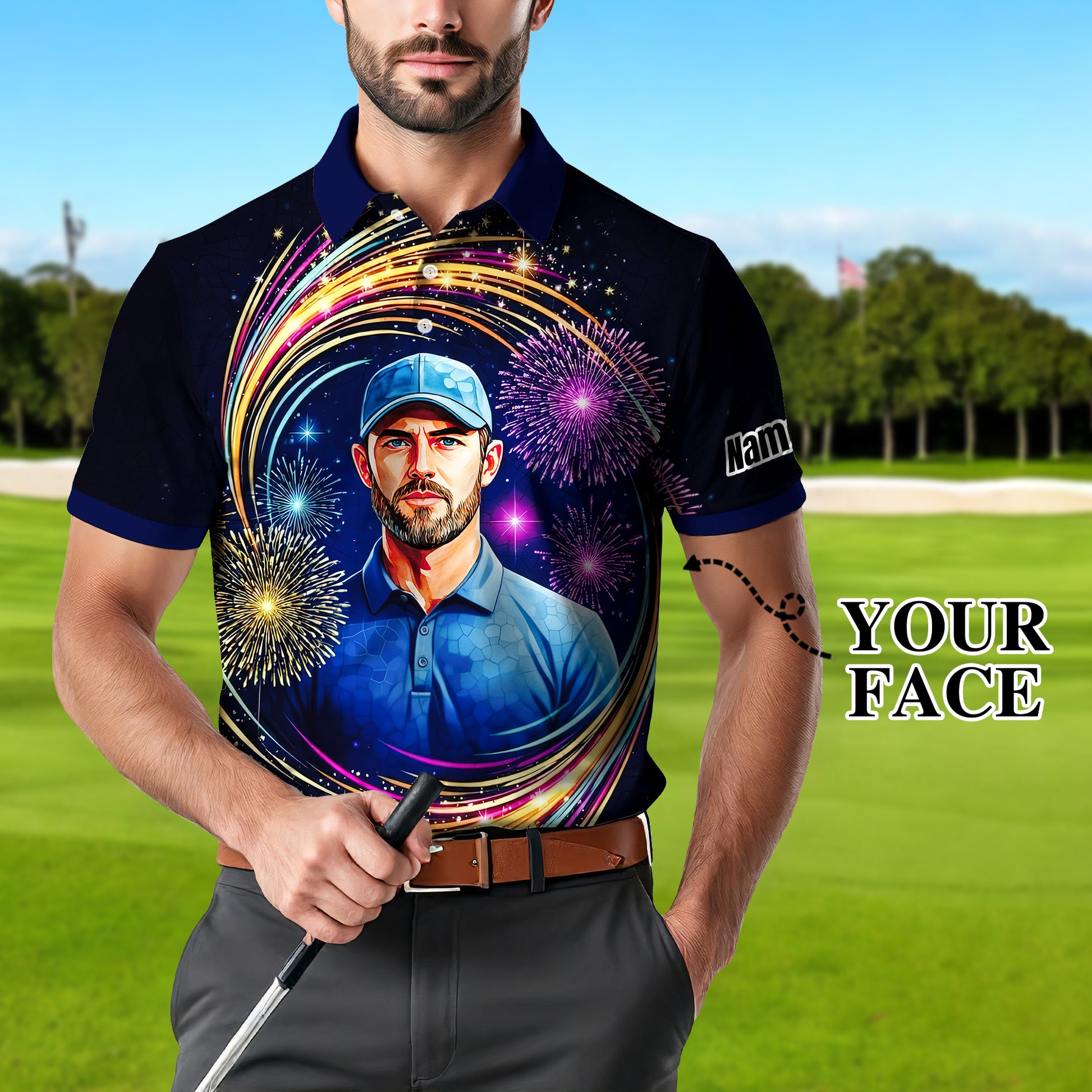 Custom Face Golf Polo Shirt – New Year Fireworks Edition | Personalized Golf Polo | Unique Holiday Gift for Him 2025 Style 1