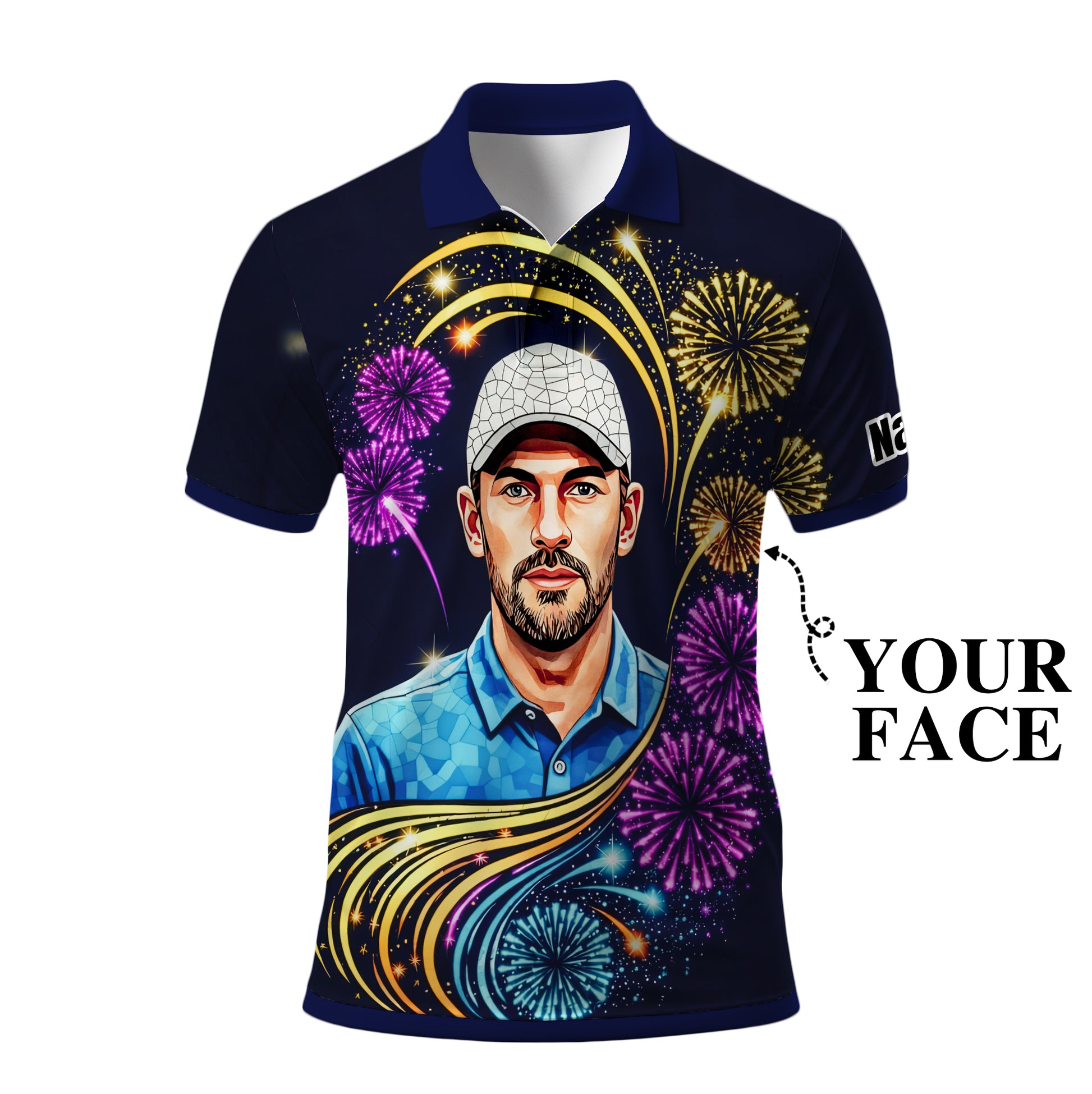 Custom Face Golf Polo Shirt – New Year Fireworks Edition | Personalized Golf Polo | Unique Holiday Gift for Him 2025 Style 6