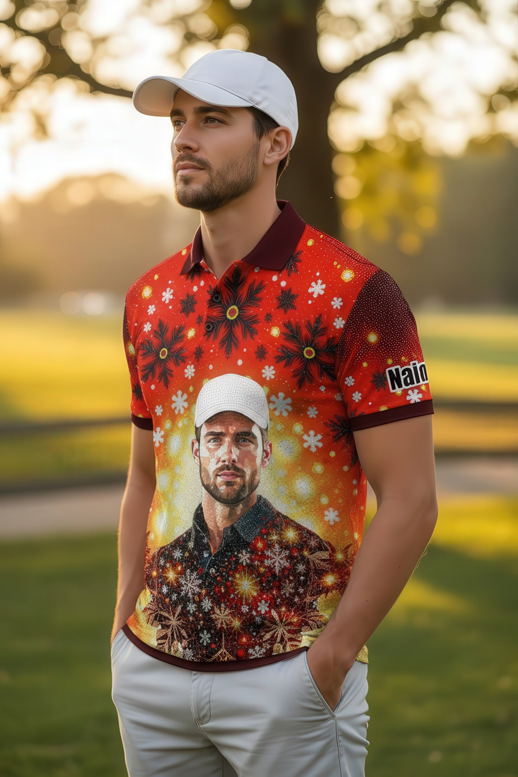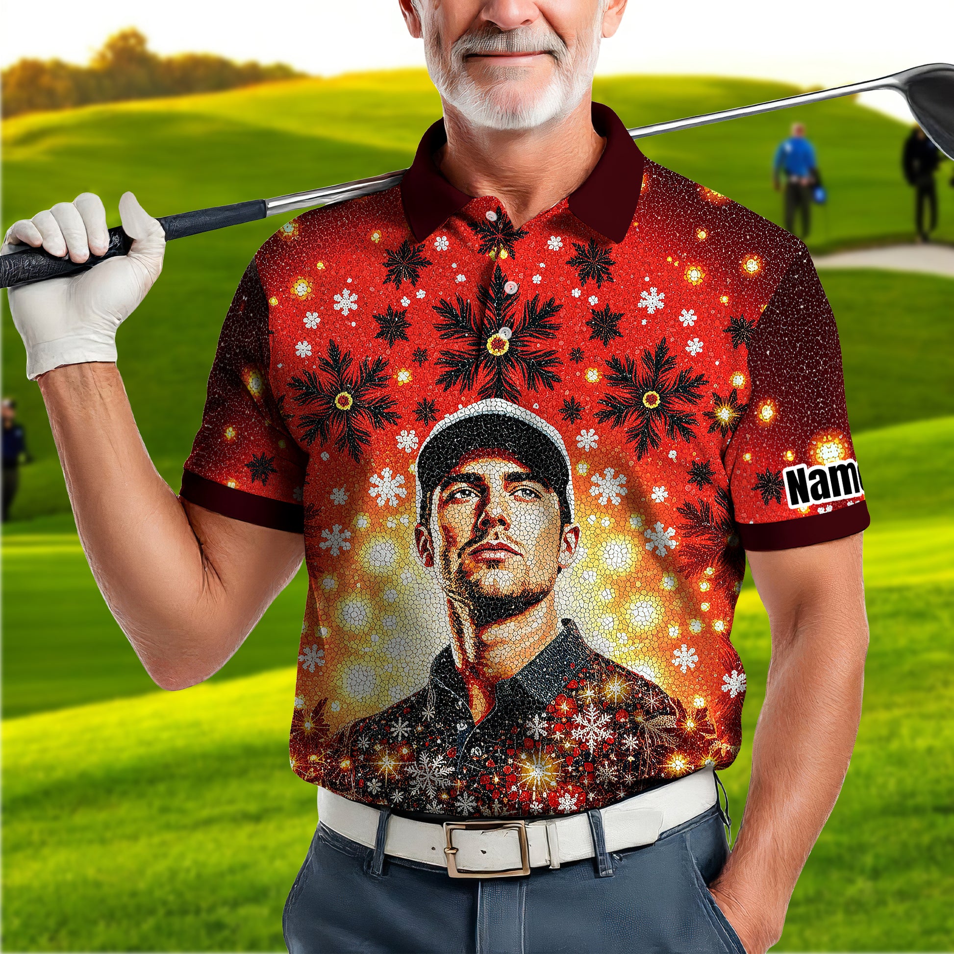 Custom Face Golf Polo Shirt – Personalized Christmas Golf Shirt for Him, Unique Holiday Gift for Golfer, Snowflake Design Golf Apparel Style 13