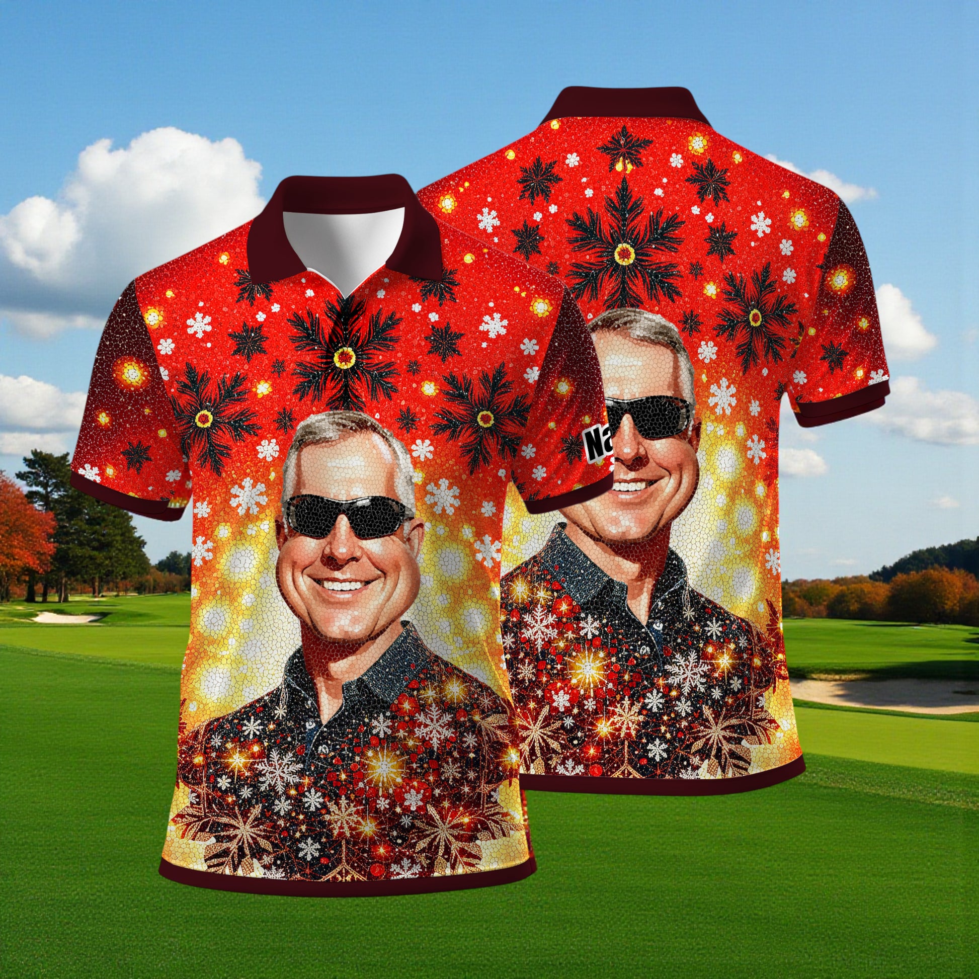 Custom Face Golf Polo Shirt – Personalized Christmas Golf Shirt for Him, Unique Holiday Gift for Golfer, Snowflake Design Golf Apparel Style 22