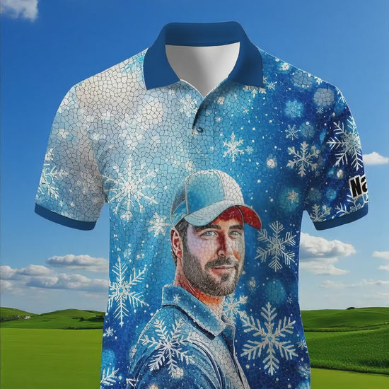Custom Face Golf Polo Shirt – Personalized Christmas Golf Shirt for Him, Unique Holiday Gift for Golfer, Snowflake Mosaic Art Design Golf Apparel Style 8