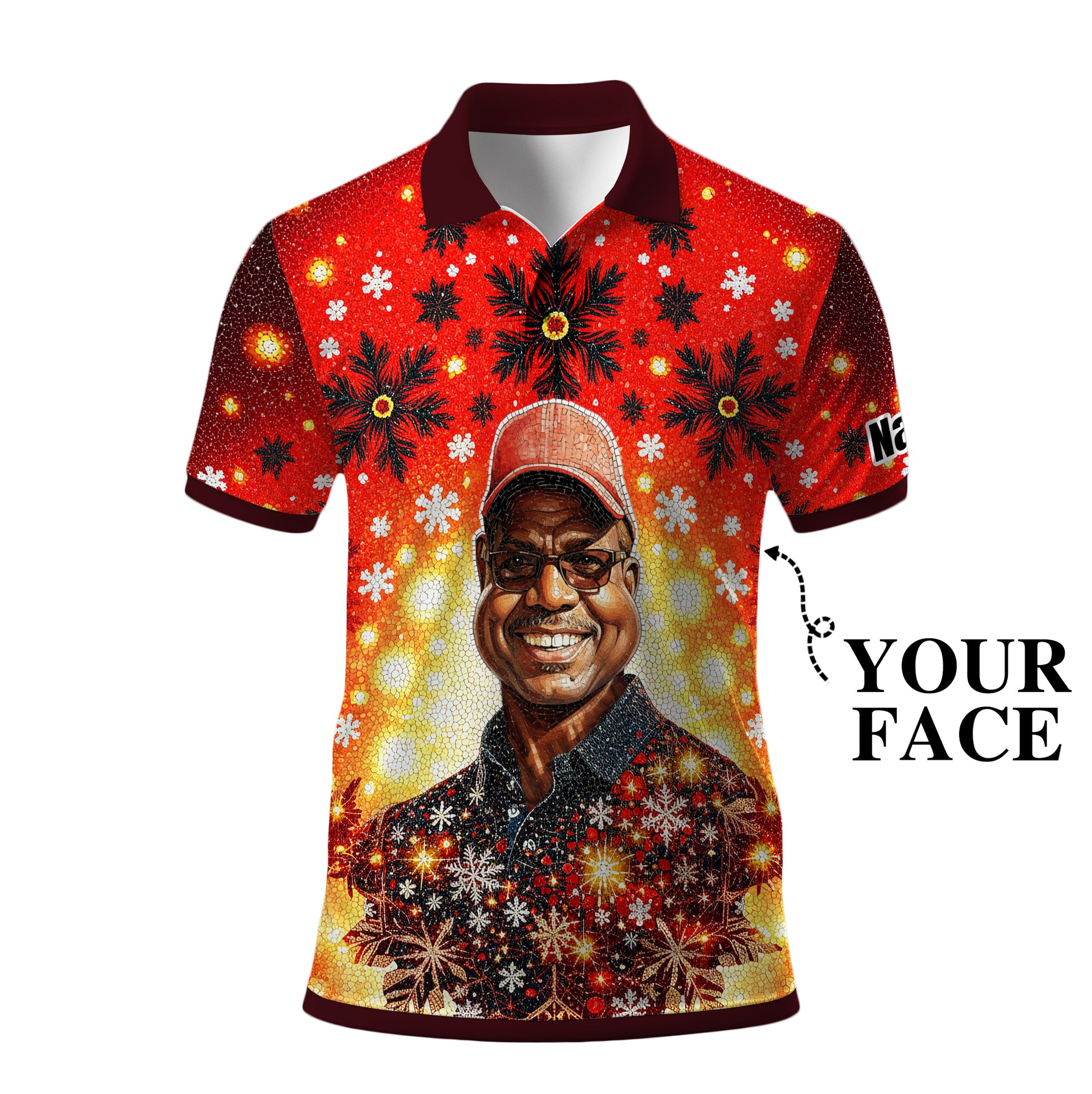 Custom Face Golf Polo Shirt – Personalized Christmas Golf Shirt for Him, Unique Holiday Gift for Golfer, Snowflake Mosaic Art Design Golf Apparel Style 13.1