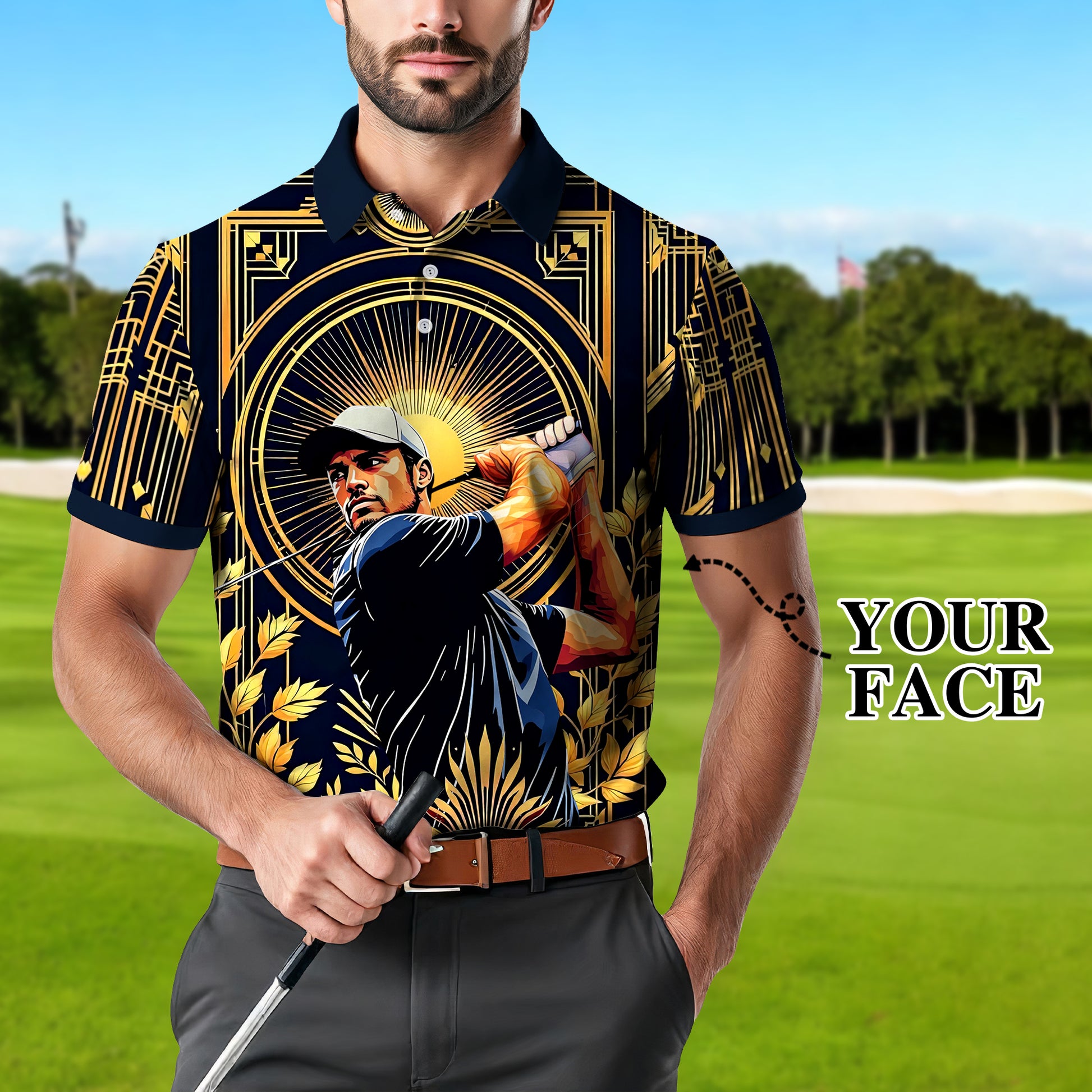 Custom Face Golf Polo Shirt – Swing in Gold Art Deco Revival Style | Personalized Golf Shirt for Men Style 6