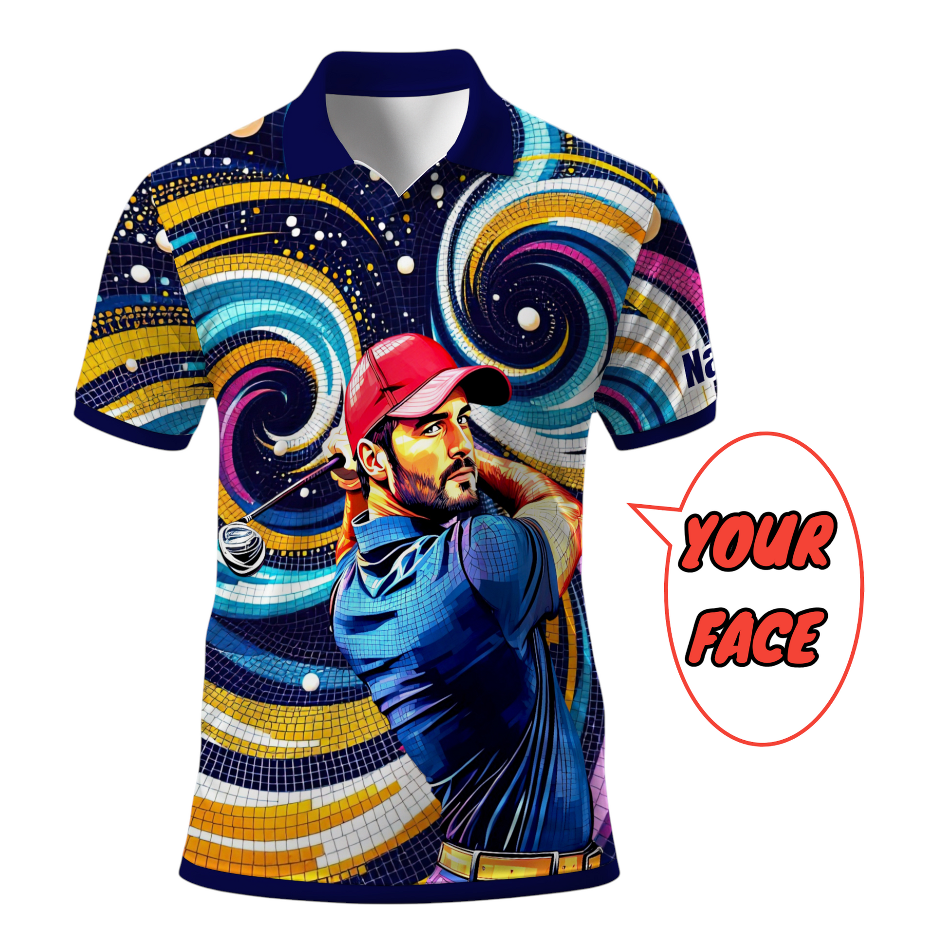 Make a bold statement on and off the course with this custom-made golf polo, featuring your face transformed into a vibrant artistic design. Perfect as a gift, sportswear, or a unique addition to your wardrobe.