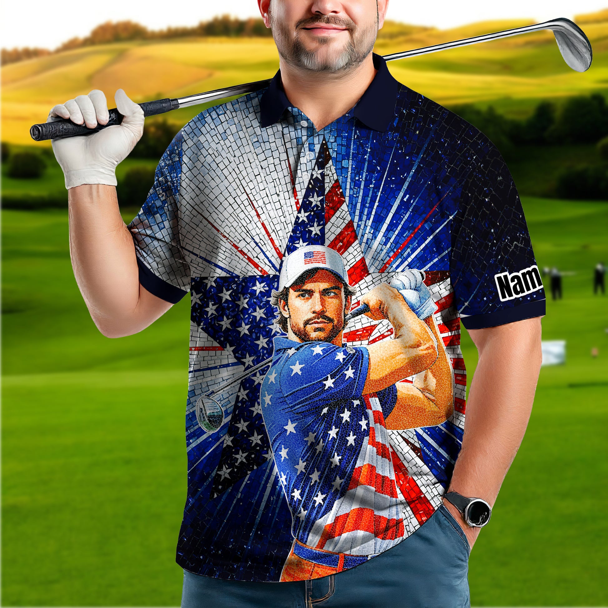 Custom Face Patriotic Golf Polo Shirt – Personalized USA Flag Design – American Pride Gift for Him – Mosaic Art Golf Shirt Style 1