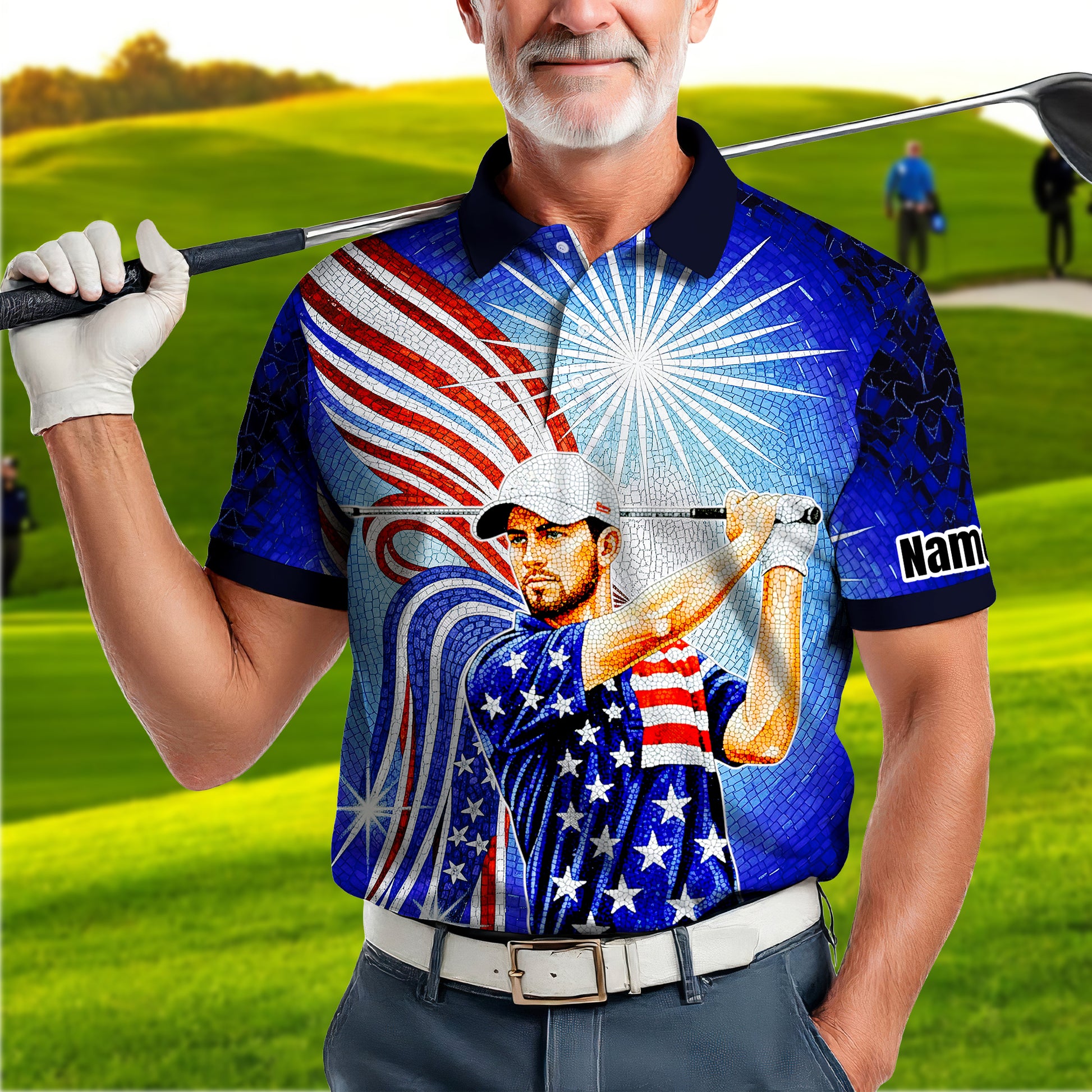 Custom Face Patriotic Golf Polo Shirt – Personalized USA Flag Design – American Pride Gift for Him – Mosaic Art Golf Shirt Style 5