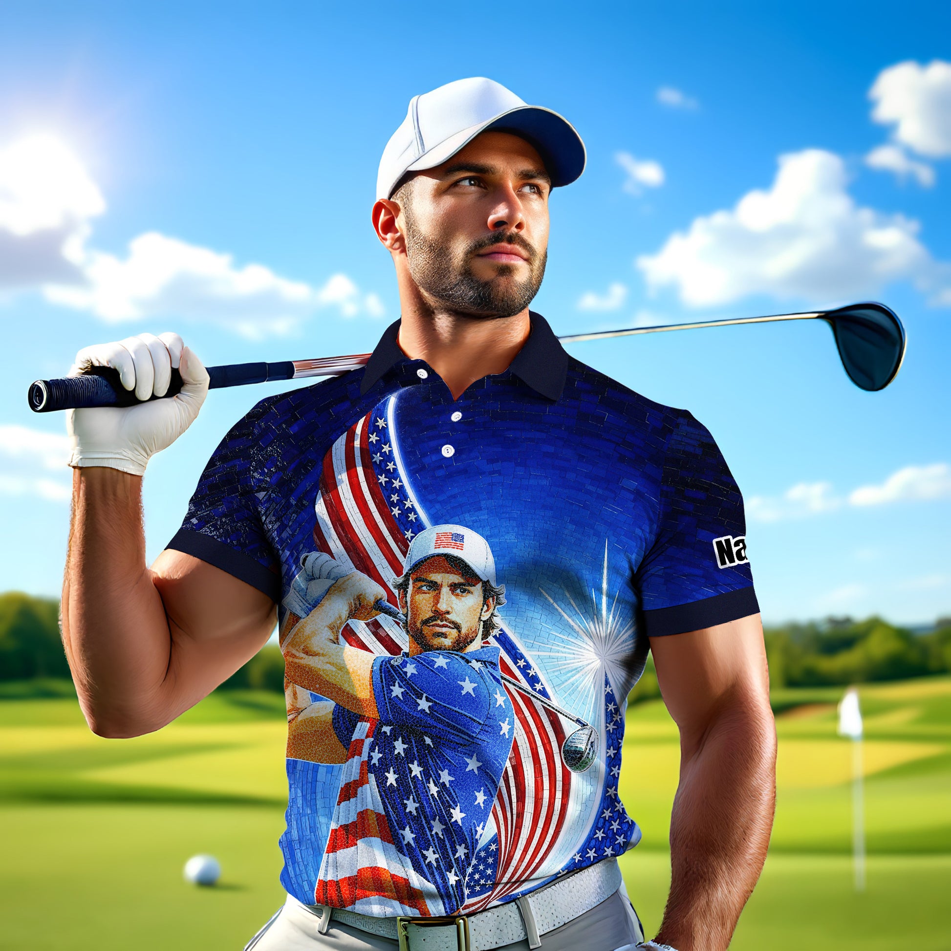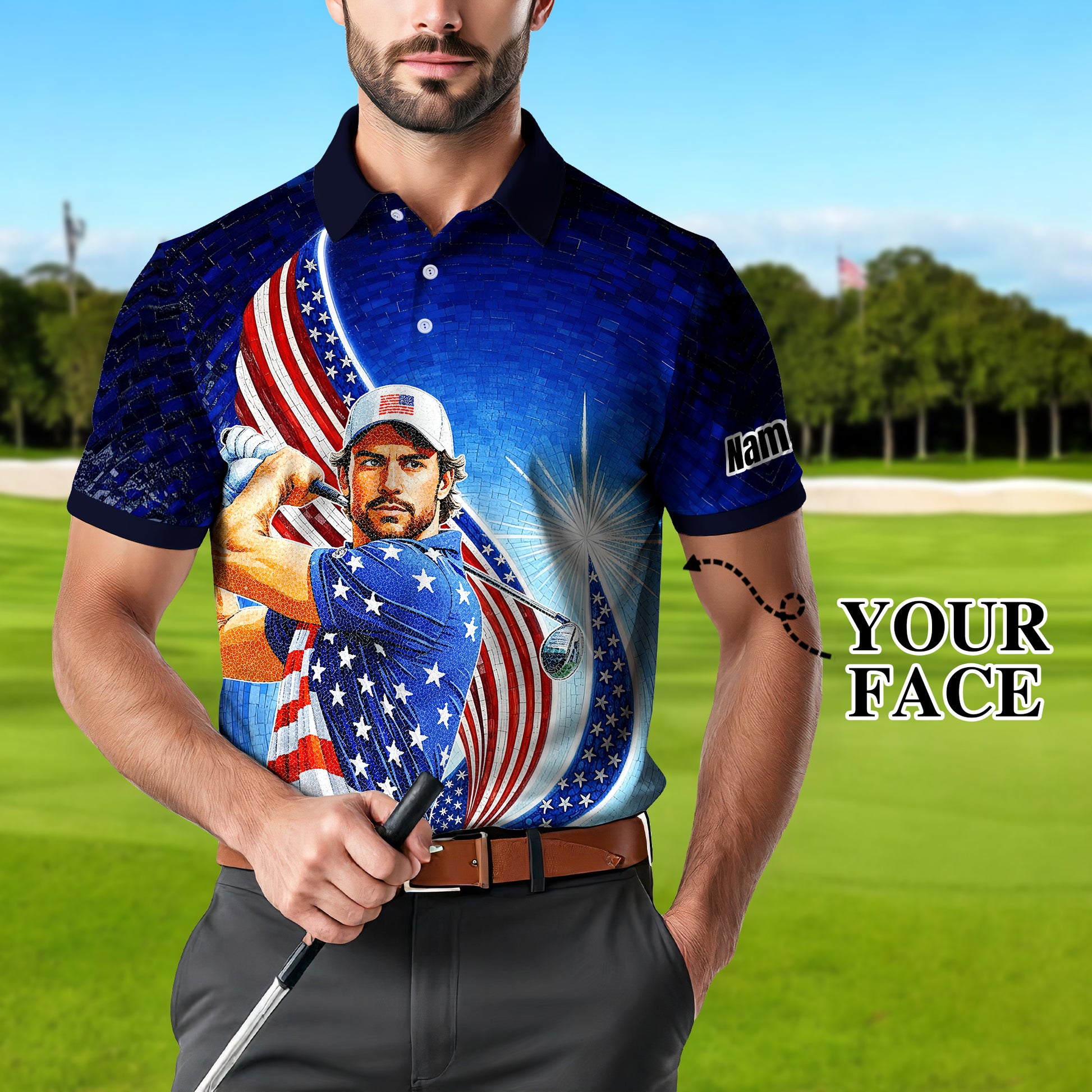 Custom Face Patriotic Golf Polo Shirt – Personalized USA Flag Design – American Pride Gift for Him – Mosaic Art Golf Shirt Style 6