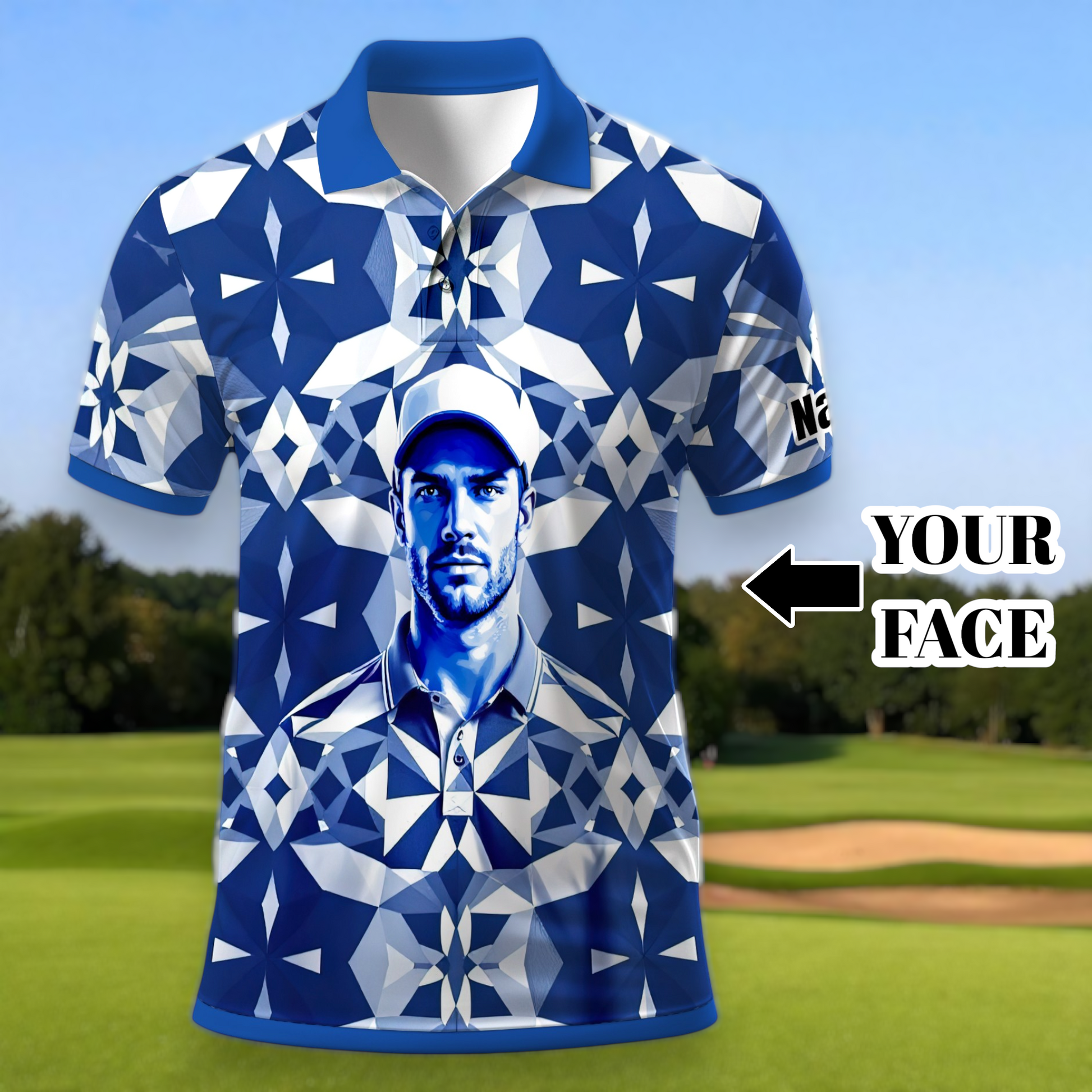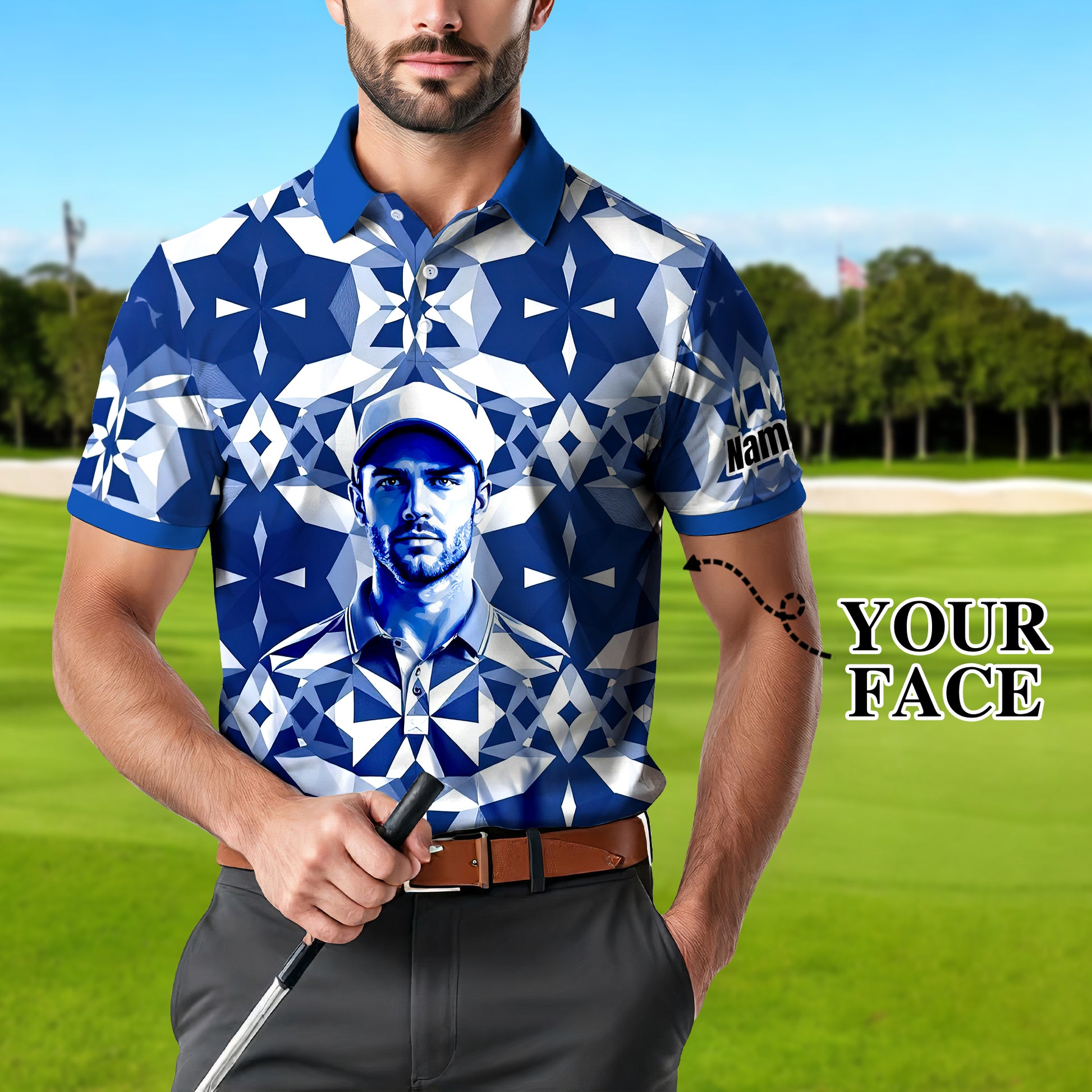 Custom Face Polo Shirt – Geometric Diamond Pattern | Personalized Photo Golf Polo | Unique Gift for Him, Retro Geometric Style Shirt Style 18
