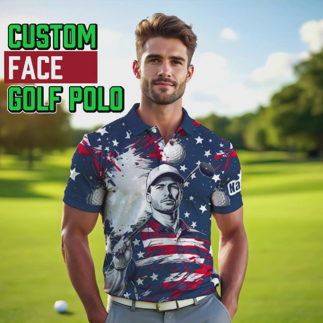 HomyGifts Men's Customized Face Artistic Golf Polo Shirt, Personalized American Flag Design, Unique Gift for Patriotic Golfers Style 19