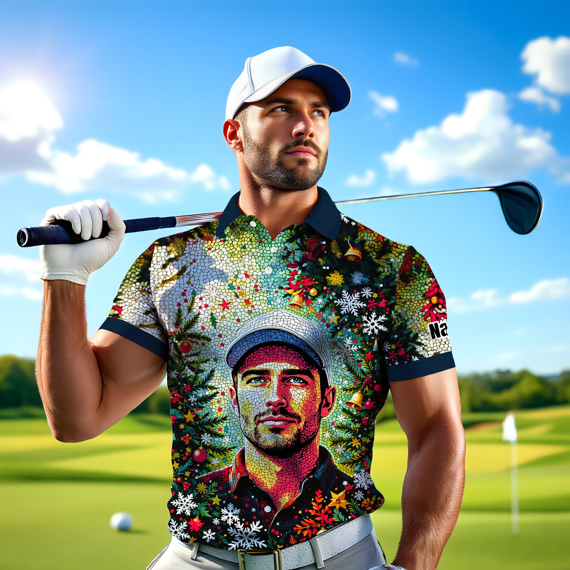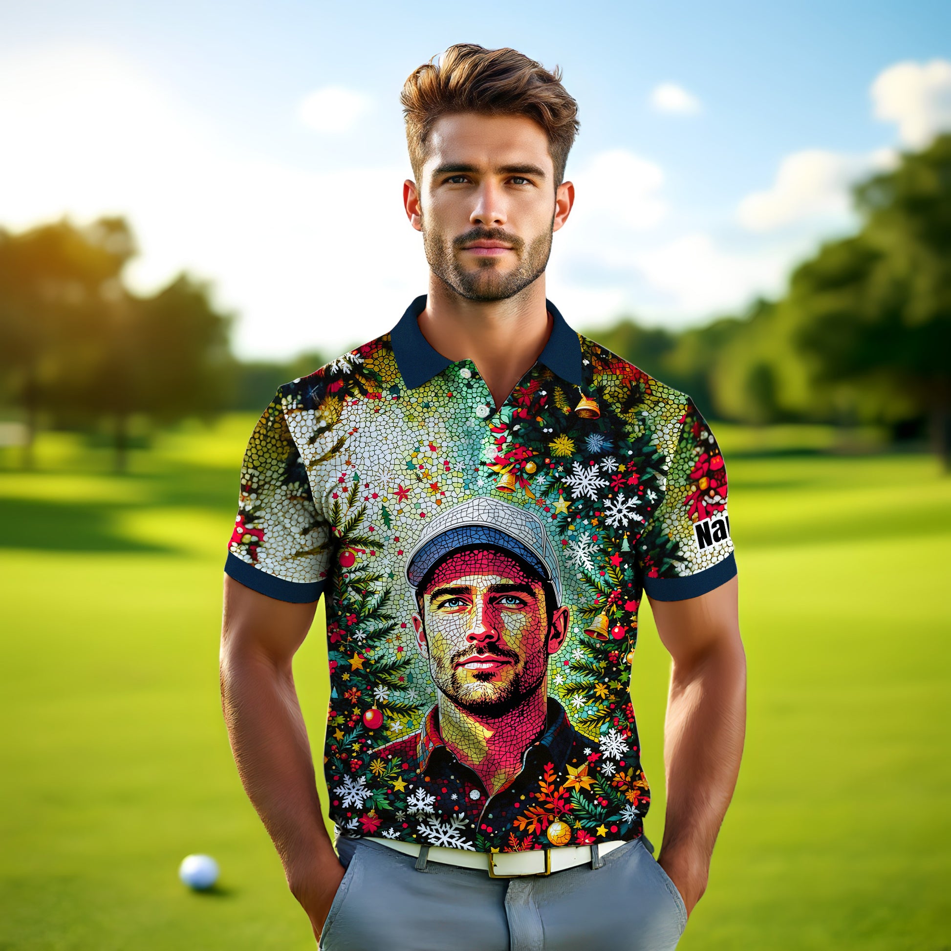 Personalized Christmas Golf Polo Shirt with Your Face – Custom Photo Holiday Shirt – Unique Mosaic Art Xmas Gift for Men, Custom Golf Apparel Style 1