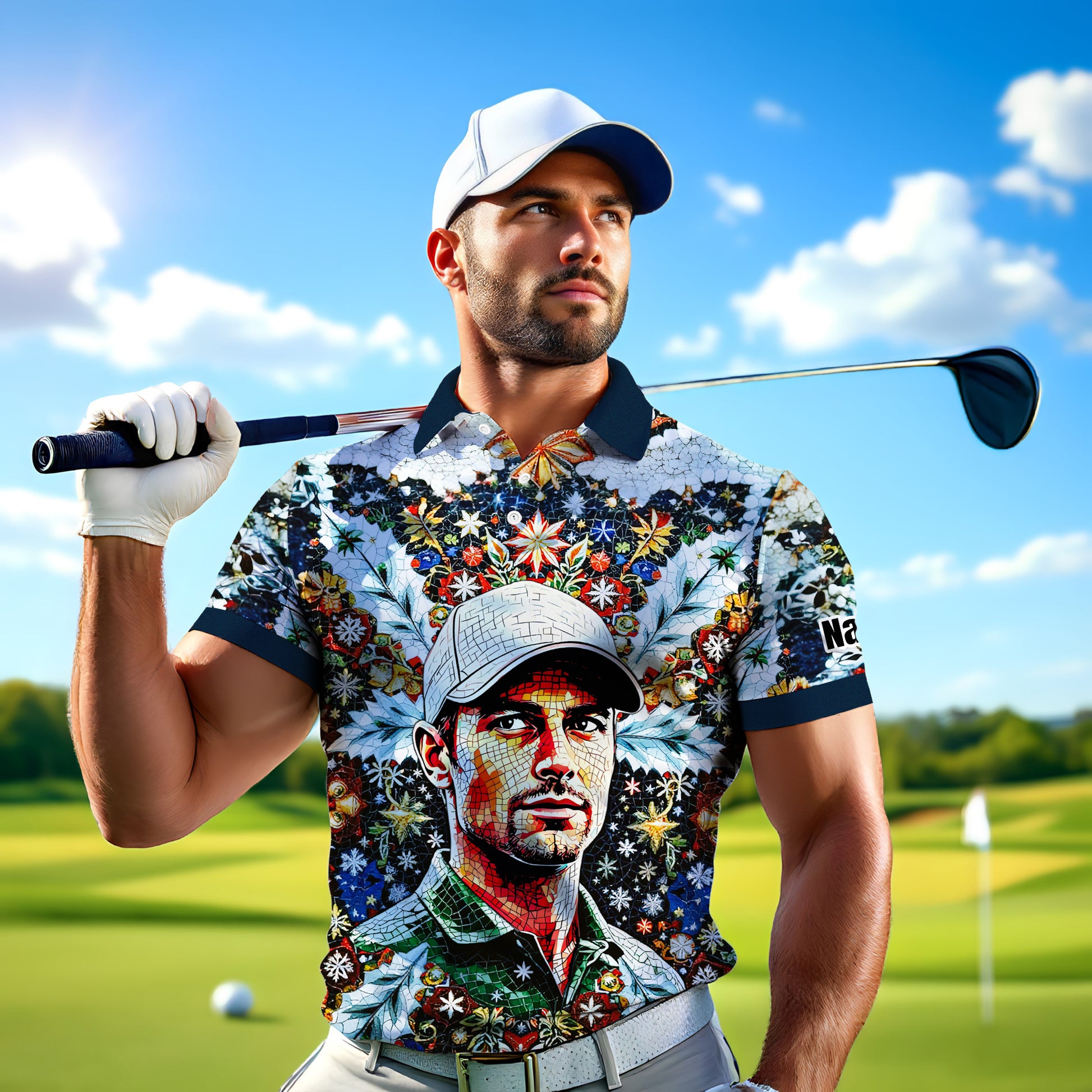 Personalized Christmas Golf Polo Shirt with Your Face – Custom Photo Holiday Shirt – Unique Mosaic Art Xmas Gift for Men, Custom Golf Apparel Style 7