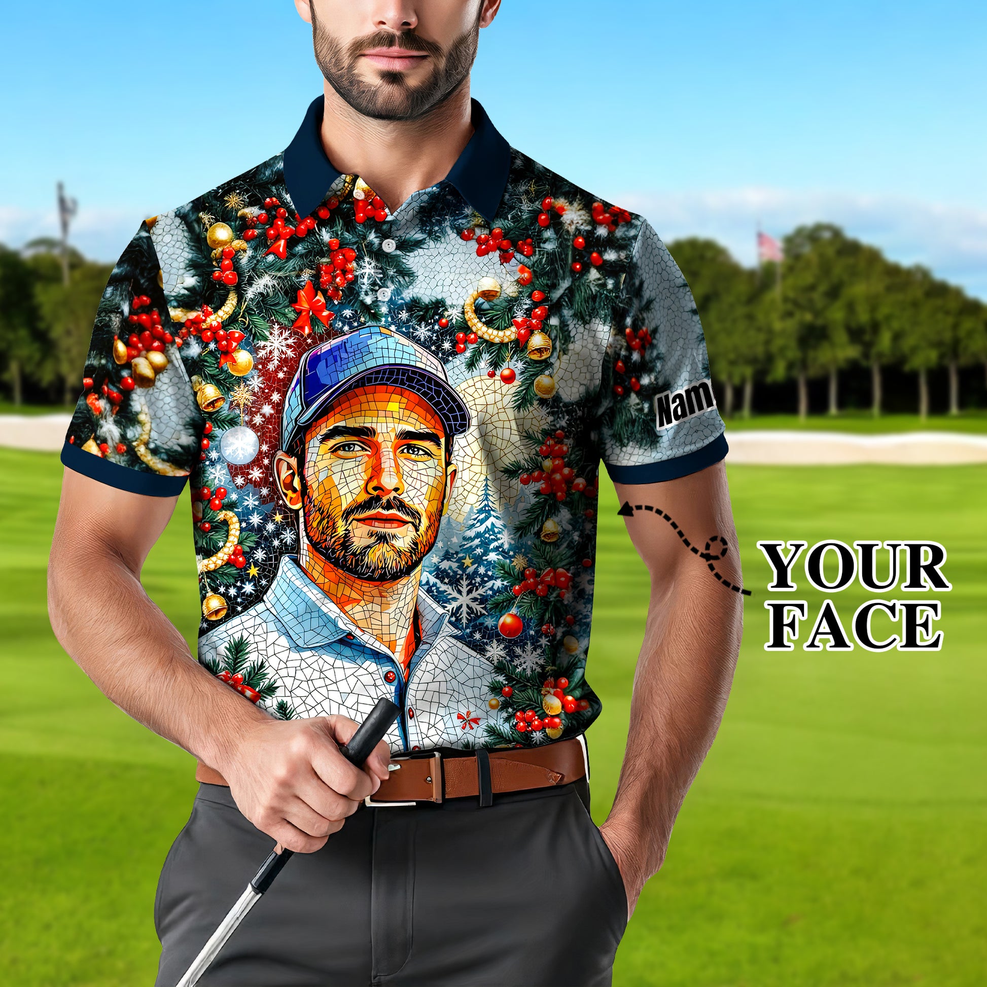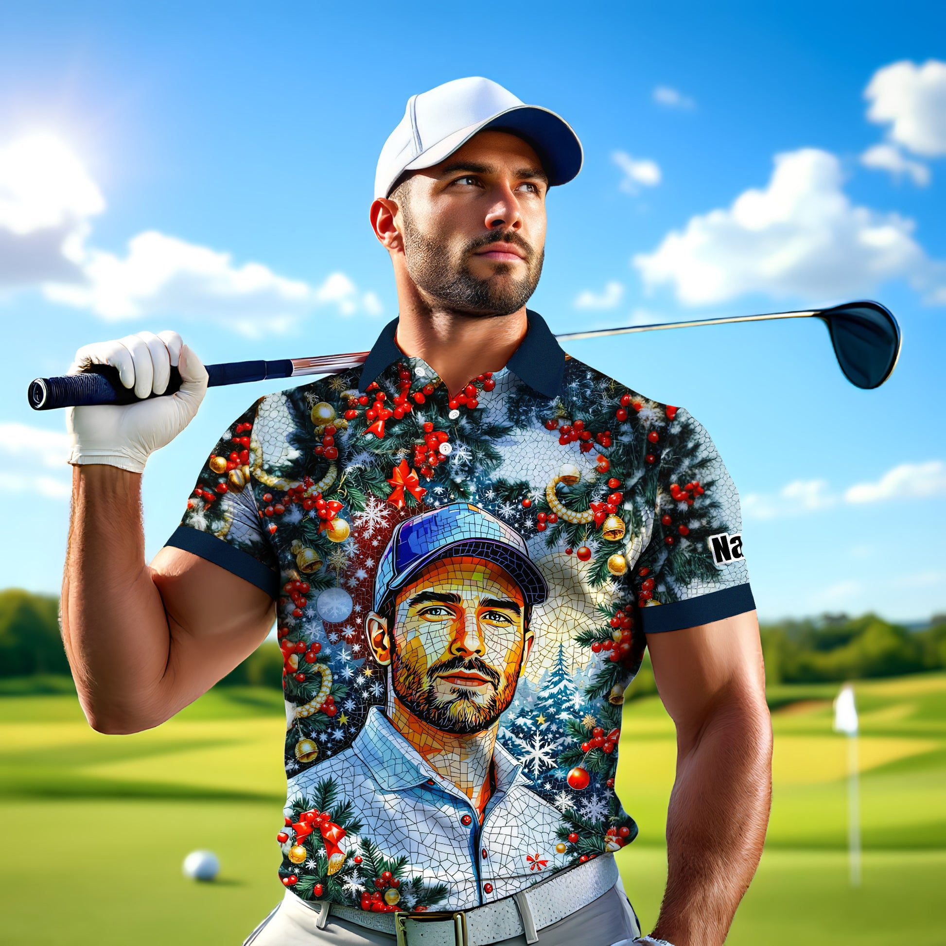 Personalized Christmas Golf Polo Shirt with Your Face – Custom Photo Holiday Shirt – Unique Mosaic Art Xmas Gift for Men, Custom Golf Apparel Style 9