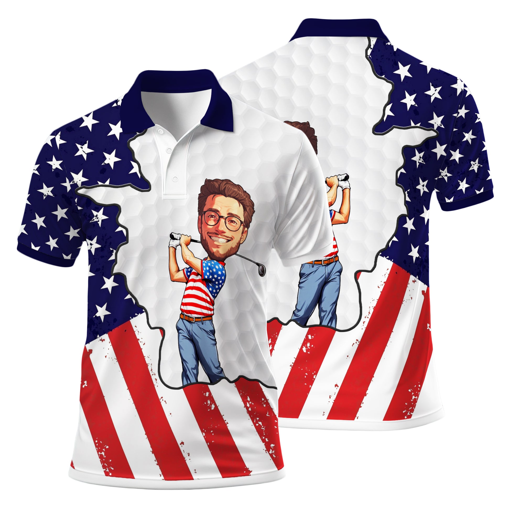 HomyGifts Men's Customized Face Artistic Golf Polo Shirt, Personalized American Flag Design, Unique Gift for Patriotic Golfers Style 1