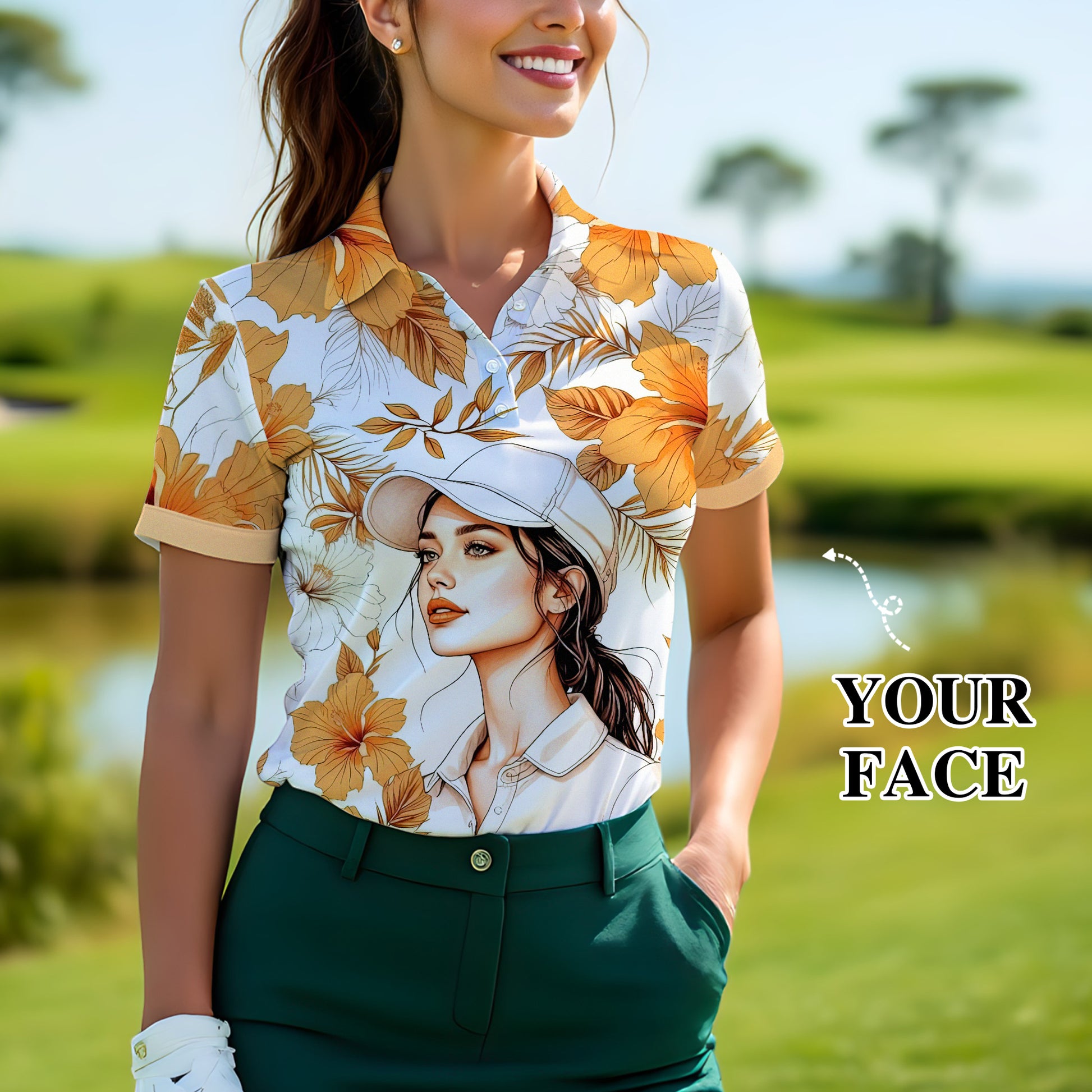 Women’s Custom Face Hibiscus Polo Shirt – Personalized Tropical Floral Polo, Unique Gift for Her, Stylish Custom Golf & Casual Wear Style 10